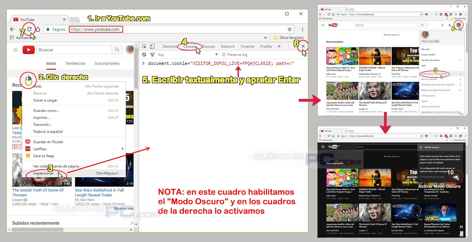 TRUCO: a partir de Chrome 57, es posible habilitar el "Modo Oscuro" en YouTube, que es más cómodo para ver videos. Son varios pasos pero no es complicado, se hace una sola vez, y es reversible.