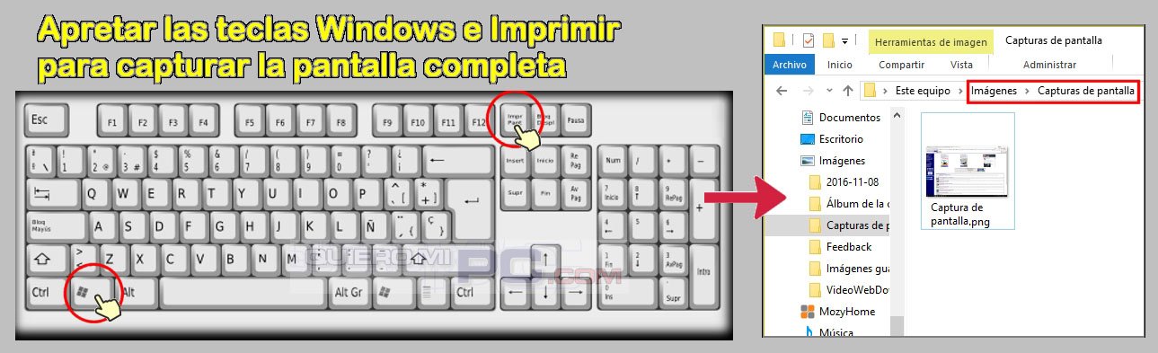 TRUCO: Apretando las teclas "Windows" e "Impr Pant" al mismo tiempo Windows captura la pantalla y la guarda en "Imágenes -> Captura de Pantalla" (en algunas notebooks la combinación es Win + Alt + Impr). Está indicado en este gráfico.