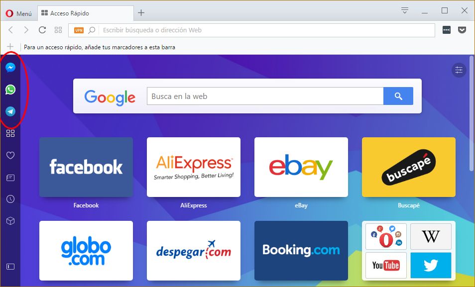 OPERA nueva versión 45. Ahora incluye accesos a WhatsApp, Messenger y Telegram directamente en su barra lateral. Excelente.