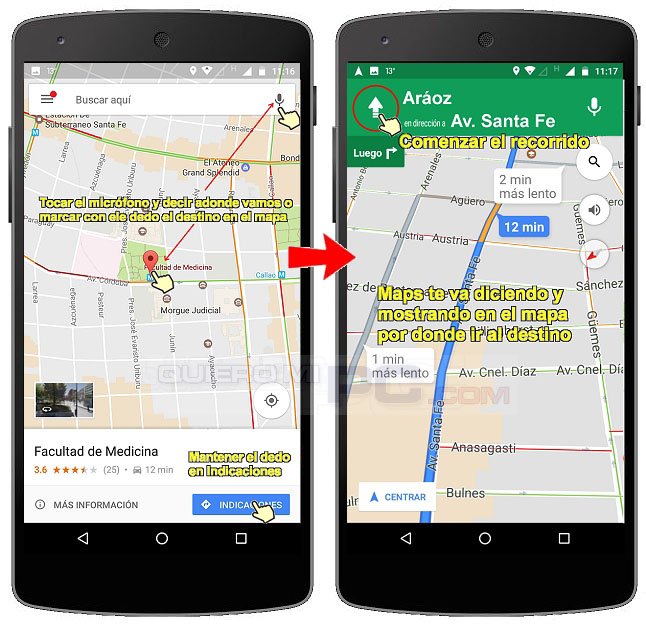 TRUCO: Para usar el celular como GPS, indicar adonde vamos por el micrófono o tocando en el mapa; mantener apretado en Indicaciones; y luego Iniciar el recorrido guiado por Maps.