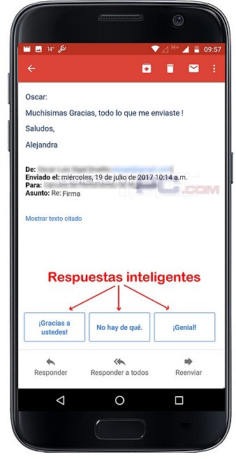NOVEDAD. Gmail para Android ahora tiene "respuestas inteligentes". Gmail te sugiere respuestas cortas en base al contexto de tu email, como en este ejemplo. Pruébalo.