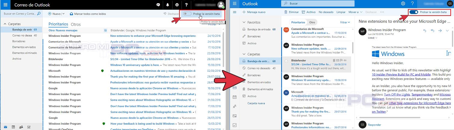 Si usas una cuenta de correo de Microsoft (Hotmail, Live, Outlook, etc) ya puedes probar la Nueva Versión Beta mucho más moderna. Ver el gráfico.