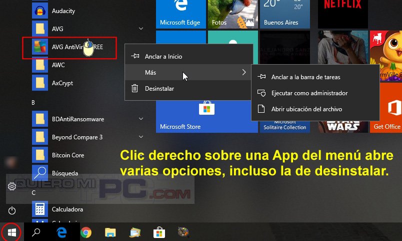 TRUCO. En Windows 10, clickeando con el botón derecho sobre cualquier programa del menú, se abren varias opciones, incluyendo la de desinstalarlo.