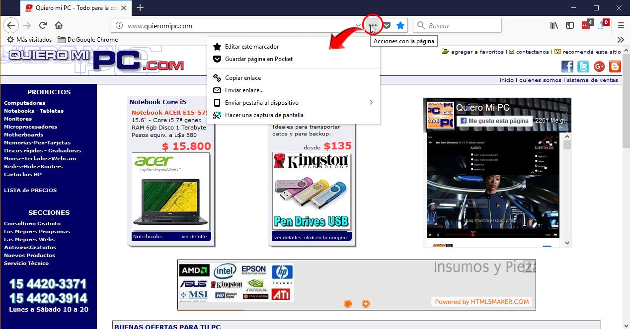 TRUCO. En Firefox Quantum con un clic puedes guardar la página en Pocket para leerla luego, hacer una captura de pantalla, o compartir por mail el link de la página a un amigo. Ver en el gráfico.