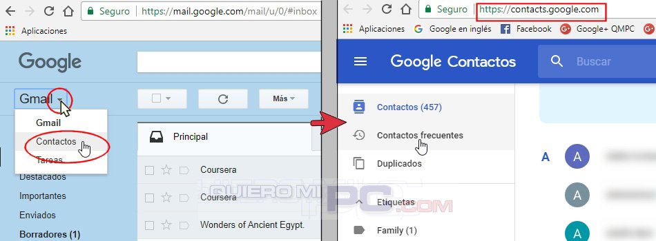 TRUCO: Puedes ir a tus CONTACTOS de Gmail desde la página de Gmail como en el gráfico, o directamente a https://contacts.google.com/ .