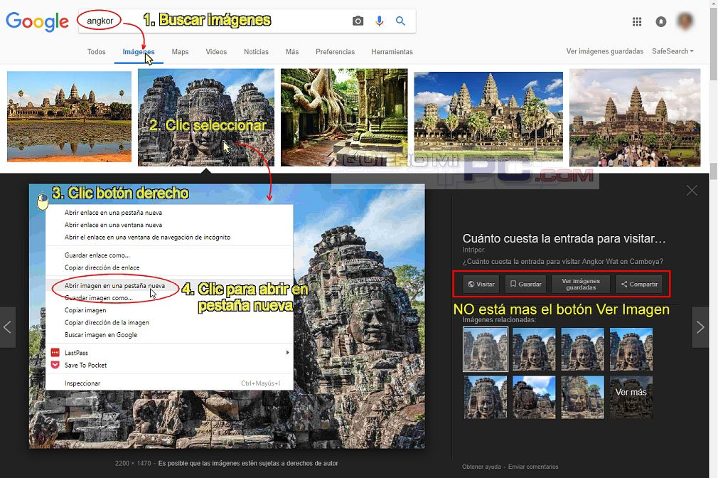 TRUCO: Cuando buscábamos imágenes en Google, el botón "ver imagen" nos permitía ampliar la imagen en una nueva pestaña. GOOGLE QUITÓ el botón por problemas de copyright, pero igual podremos hacerlo como indicamos en el gráfico.