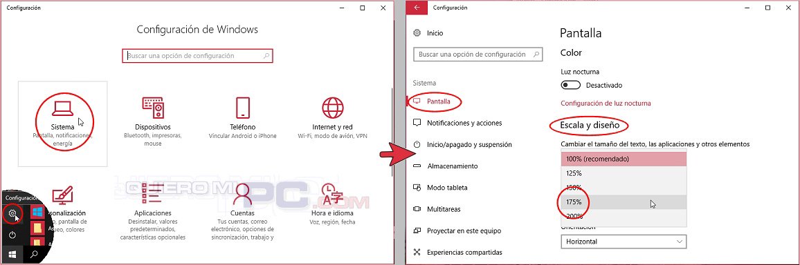 TRUCO: Si las letras o íconos de la pantalla te resultan muy chicos, Windows 10 te permite cambiar la escala en la Configuración de la Pantalla. Ver los pasos del gráfico.