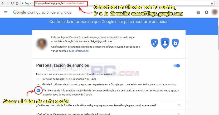 TRUCO: Cuando buscas algo en Google luego te vuelven loco con anuncios. En Chrome esto se puede desactivar. Estando logueado en Chome, ir a adssettings.google.com, y destildar la opción. Ver el gráfico.