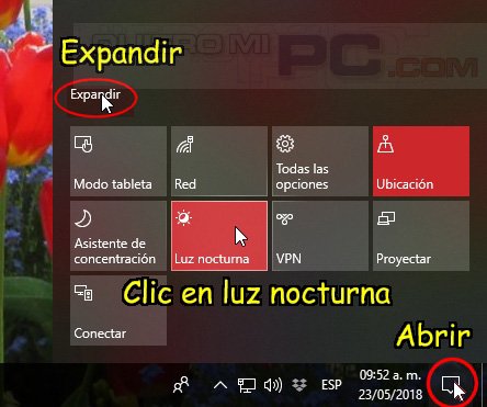 TRUCO: April Update de Windows 10 introdujo "Luz Nocturna" para disminuir el brillo cuando hay poca luz ambiente. Para habilitarla, abrir el área de notificación, expandirla, y activarla como en el gráfico.