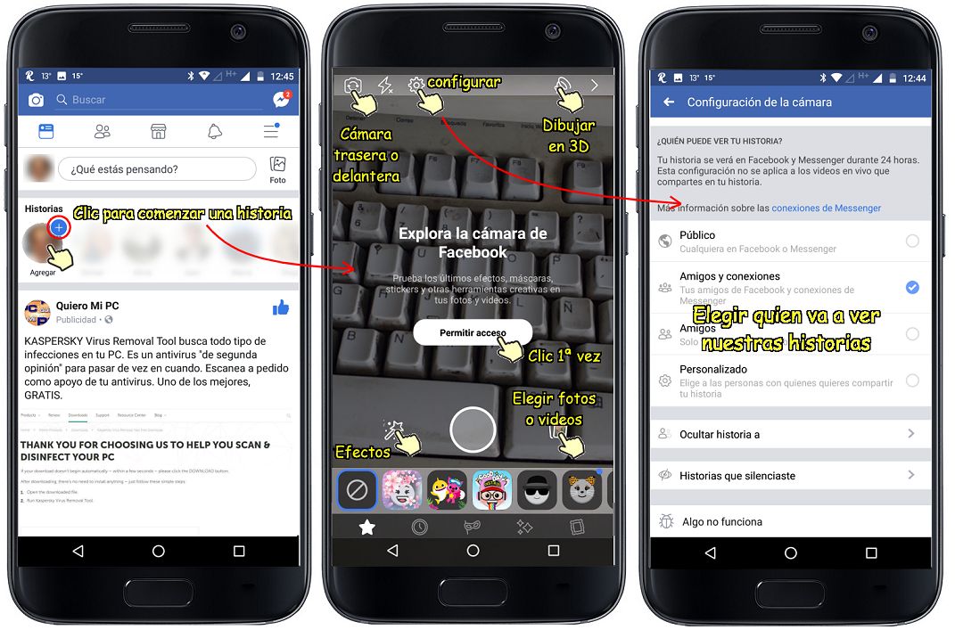 TRUCO: Muchos no saben que Facebook también tiene HISTORIAS como las de Instagram. Combina fotos, videos, textos, efectos, dibujos etc. Elegimos quien las podrá ver, y se borran a las 24 horas. Ver el gráfico.