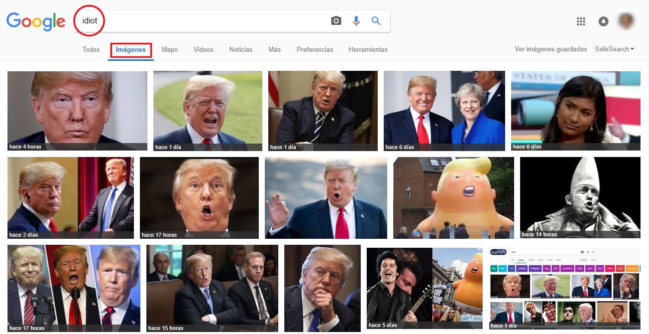 INCREÍBLE. Si buscan la palabra IDIOT en Imágenes de Google, el resultado que más aparece es: Donald Trump!! Pruébenlo.