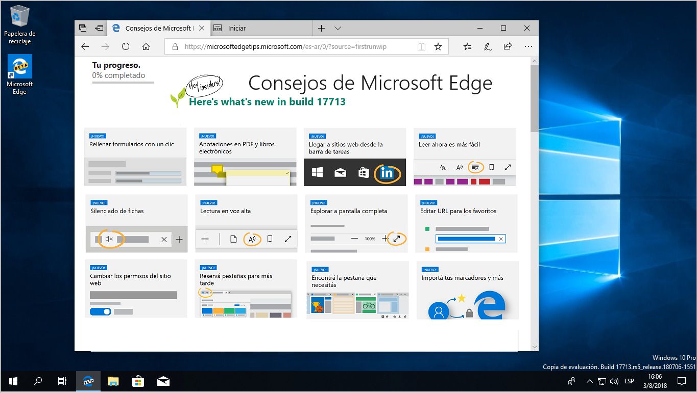 NUEVO EDGE. En esta captura de pantalla vemos las muchas mejoras de Microsoft Edge en Windows Insider Redstone 5, que serán incluídas en la próxima gran actualización de Octubre.