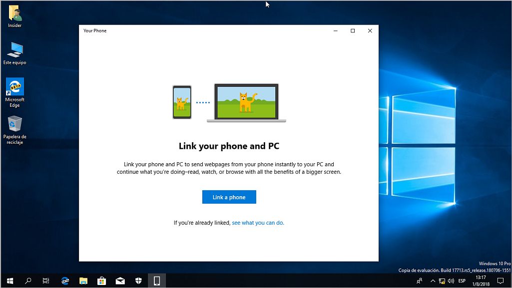NUEVA aplicación "Your Phone" de Windows10 que te permitirá usar tu teléfono desde la comodidad de la pantalla grande y el teclado de tu PC. Estará en la próxima actualización de Windows. La foto es de una PC virtual con Windows Insider Redstone 5.