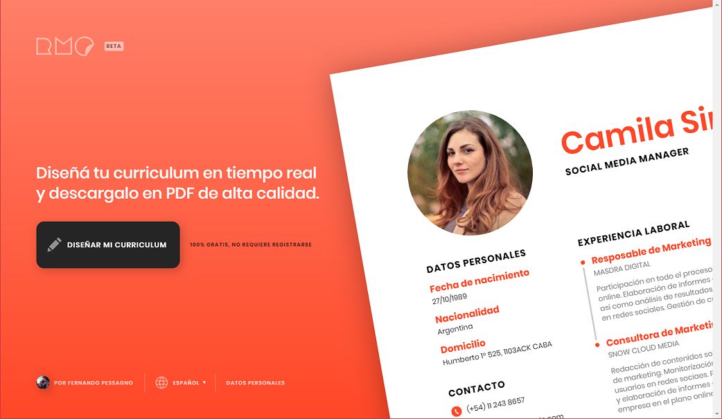 Con ResumeMaker crea tu curriculum profesional, online sin instalar nada, sin registrarte, sin publicidad, descargalo en PDF de alta calidad, y todo gratis.