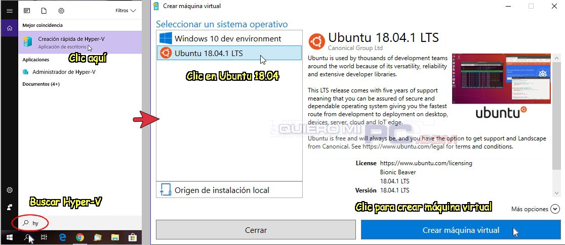 HYPER-V. Si ya tienen activado Hyper-V (ver post anterior), pueden crear una máquina virtual con Ubuntu 18.04 optimizado para Windows 10 con un sólo clic. Ver los pasos en el gráfico.