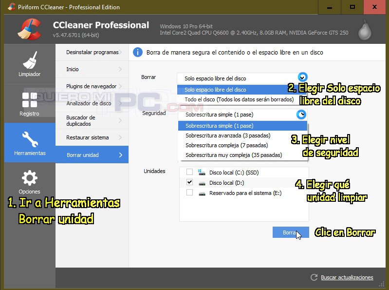 TRUCO SEGURIDAD: borrar un archivo no significa eliminar realmente sus datos. Cualquier experto podría recuperar tus archivos borrados. El famoso CCleaner (www.ccleaner.com) permite eliminar todos los archivos borrados en forma definitiva, como indica el gráfico.
