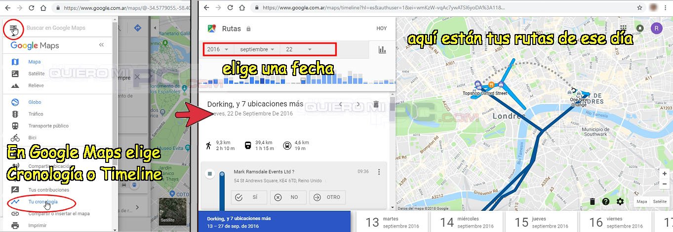 TRUCO: Cuidado!! Si tienes activada la ubicación en tu smartphone, Google guarda todos tus recorridos en Maps. Puedes consultar tus rutas y ubicaciones de cualquier día como indica el gráfico.