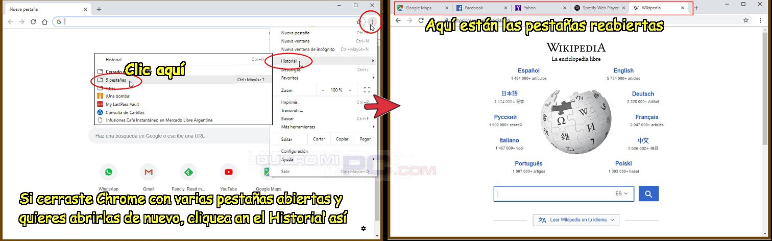 TRUCO: Si por accidente cerraste Chrome con varias pestañas abiertas y quieres re-abrirlas, lo puedes hacer desde el Historial como en el gráfico.