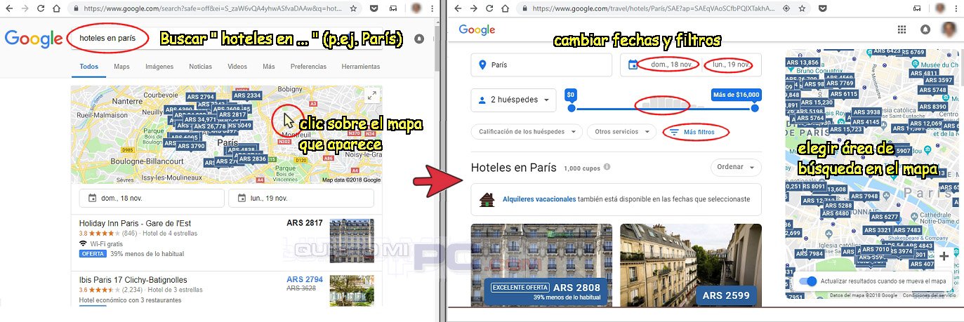 TRUCO: Se puede buscar hoteles en Google directamente sin ir a Trivago o Booking. Sólo busquen "hoteles en ..." (por ejemplo París), como en el gráfico. Prueben ahora.