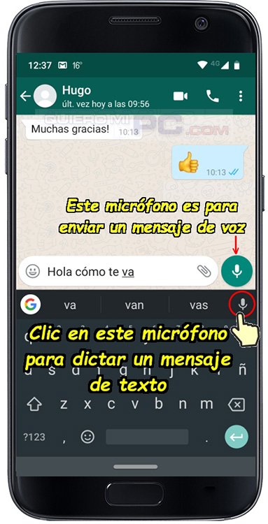 TRUCO: En WHATSAPP puedes escribir un mensaje con el teclado, o puedes enviar un mensaje de voz. Pero también puedes enviar un mensaje de texto DICTANDOLO en lugar de usar el teclado, con el micrófono del teclado como se ve en el gráfico.