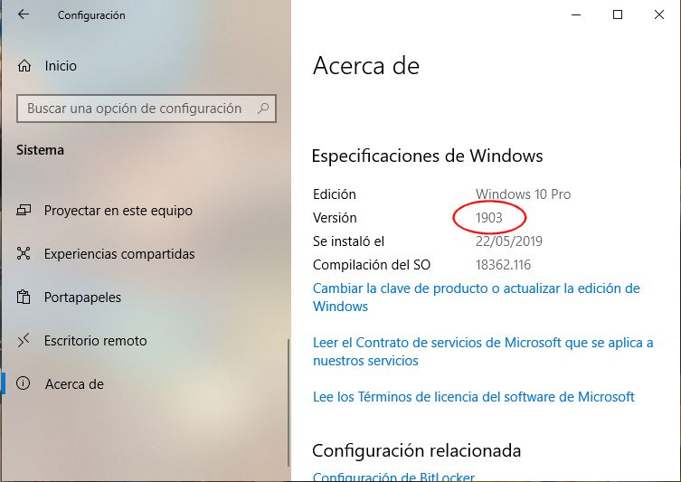 INSTALADO con éxito el "May 2019 Update de #Windows10. En el gráfico indica la versión 1903 que corresponde a esta actualización. En poco más de 1 hora y sin ningún problema.