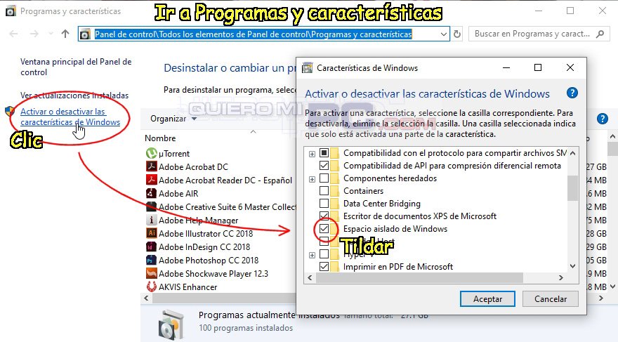 NUEVO. SANDBOX es una nueva función de May 2019 Update. Se trata de una manera de correr programas desconocidos en un “espacio aislado”. Así podremos probar la aplicación sin riesgo de infectar nuestra PC. Para habilitarlo (solo Windows Pro o Enterprise) seguir los pasos del gráfico.