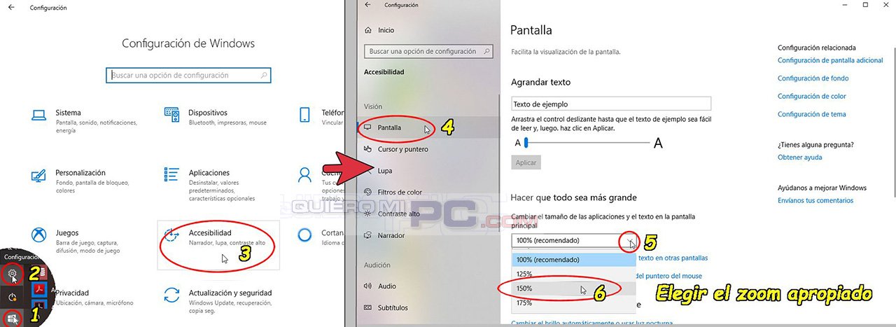 TRUCO: Si en la pantalla todo aparece muy pequeño, en Windows 10 podemos fácilmente agrandar todos los elementos de la misma, textos, íconos etc. con unos clics. Ver los pasos en el gráfico.
