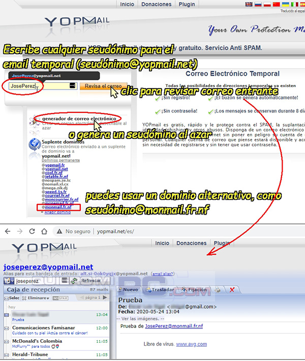 TRUCO. Algunas webs te piden registrarte para usarlas. Si no quieres usar tu email, puedes registrarte con un "mail temporal". YOPmail te permite generar uno. Podrás poner cualquier nombre, y revisar desde la página de YOPmail los correos que recibas para verificarte en esas webs. Este correo temporal se borrará luego de 8 días. GRATIS en español. http://www.yopmail.net/es/