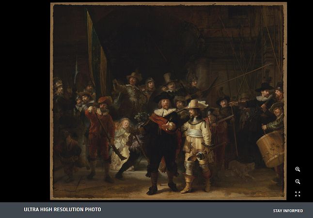La Web del Rijksmuseum de Ámsterdam muestra una imagen de 717.000 millones de píxeles de 'La ronda nocturna' de Rembrandt. La imagen de un cuadro más detallada del mundo. Prueben agrandarla hasta ver la más mínima partícula de pigmento. Gratis.
